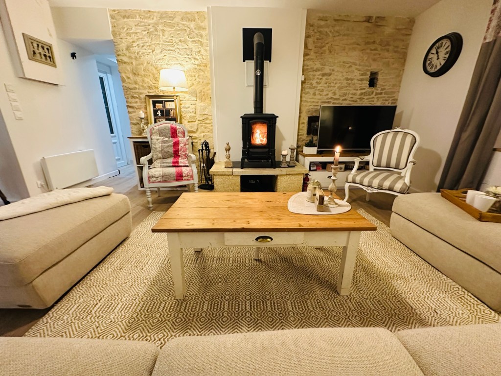 Salon avec poêle à bois, TV connectée, Netflix, youtube, chaînes internationales
